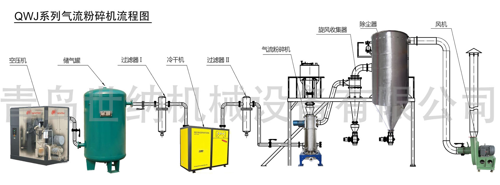 引風機、電控櫃等組成。壓縮空氣經過濾幹燥除油後(hòu),通過特殊配置的噴嘴高速噴射入粉碎腔(qiāng)內,在高壓氣(qì)