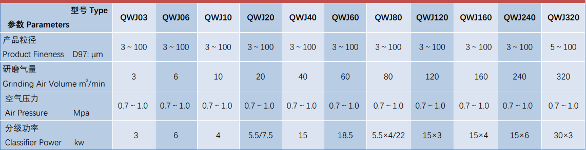 注:1.設備的處理量與物料的性質及產品(pǐn)粒度要求有關。 2.產品粒(lì)度可(kě)調。