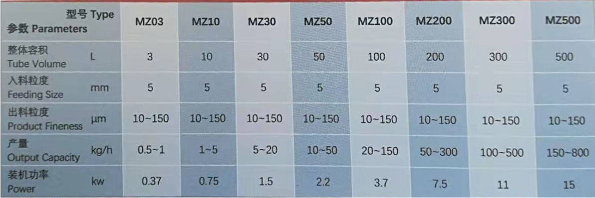 注:1.設備的處理(lǐ)量與物料(liào)的性質及(jí)產(chǎn)品粒度有關。 2.產品粒度(dù)可調。