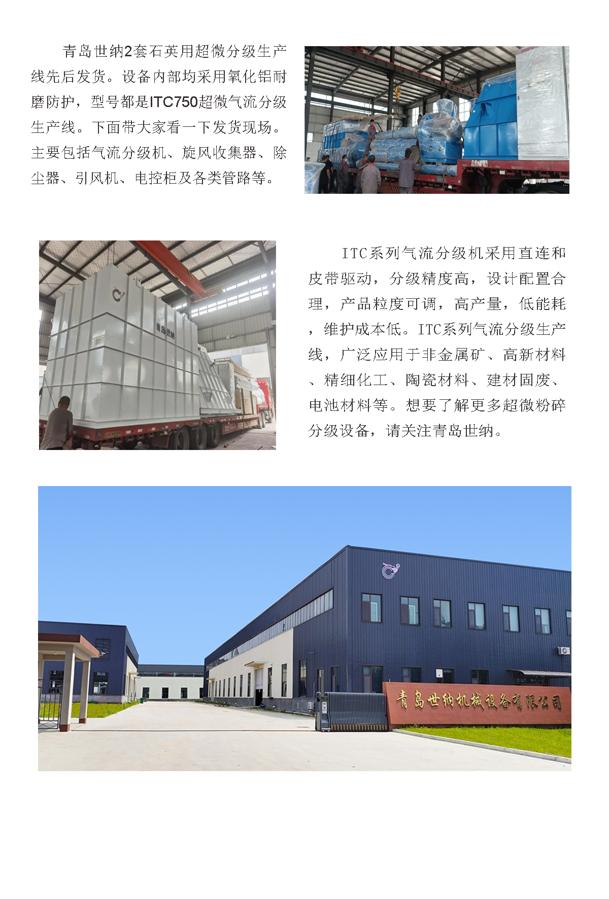 【青島青青草网站】2套石(shí)英用(yòng)ITC750氣流(liú)分級生產線(xiàn)發貨現場