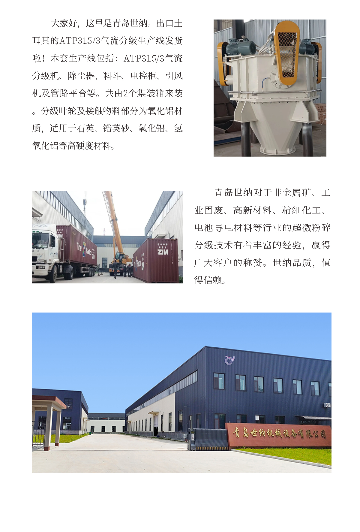 【青島青青草网站】出口土耳(ěr)其的ATP315/3氣流分級生產線發貨現場